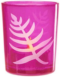 2.25 inches x 2.5 inches high. A colored glass cup adorned with ferns. Perfect accent for the cold seasons that will get you through until the flowers bloom. For use with flameless or regular tea lights.